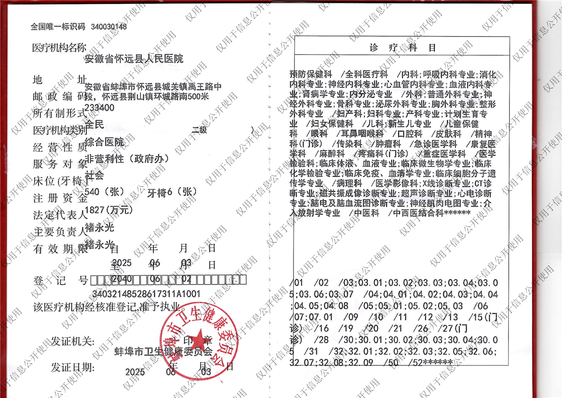 医院占地面积6879平方米,建筑面积26088平方米,编制床位数540张,临床医技科室29个。在职职工583人,高级职称专业技术人员120人,其中正高21人,中级职称专业技术人员245人。拥有三个市级临床重点专科(泌尿外科、心血管内科、神经内科)、一个市级重点培育专科(心血管内科)、一个蚌埠市临床重点特色专科(妇产科),四个县级临床重点专科(骨科、神经内科、消化内科、新生儿科)、五项市级科研项目(1.末端可弯曲负压吸引鞘与智能恒压清石系统联合输尿管软镜治疗上尿路结石的临床应用研究。2.高频QRS波联合外泌体代谢组学在冠心病个体化精准防治中的前瞻性队列研究。3.多学科团队诊疗模式下家庭访视在脑卒中患者中的应用研究。4.高风险人群前列腺癌“PSA筛查-mpMRI检查-靶向穿刺”筛查模式在基层医院基于紧密型医共体模式下的应用研究。5.靶向miR-141脱氧核酶微球调控Sirt1/NF-κB轴介导的氧化应激促进退变髓核细胞再生),并参与一项国家级“十四五”重点专项中国母子队列研究项目。