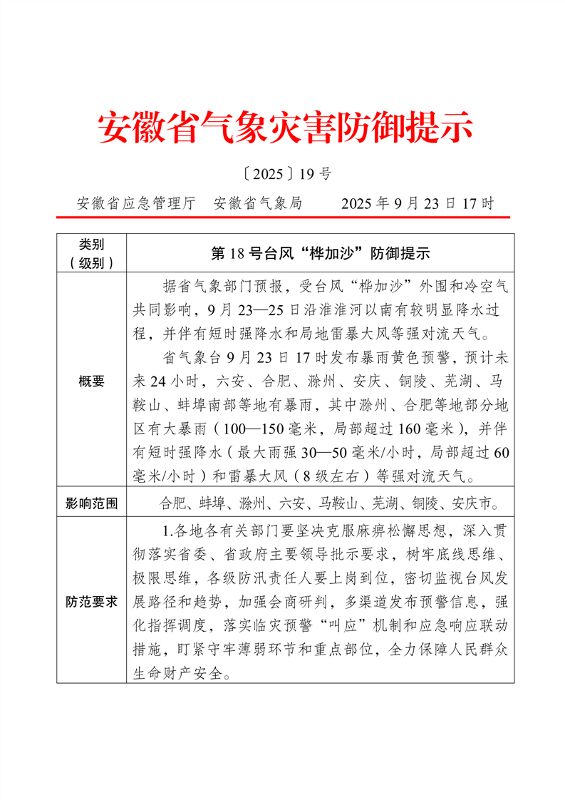 【自然灾害类预警提示】第18号台风“桦加沙”防御提示〔2025〕19号
