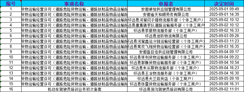 怀远交通运输局2025年9月行政审批信息台账(2025年9月1日——2025年9月8日)